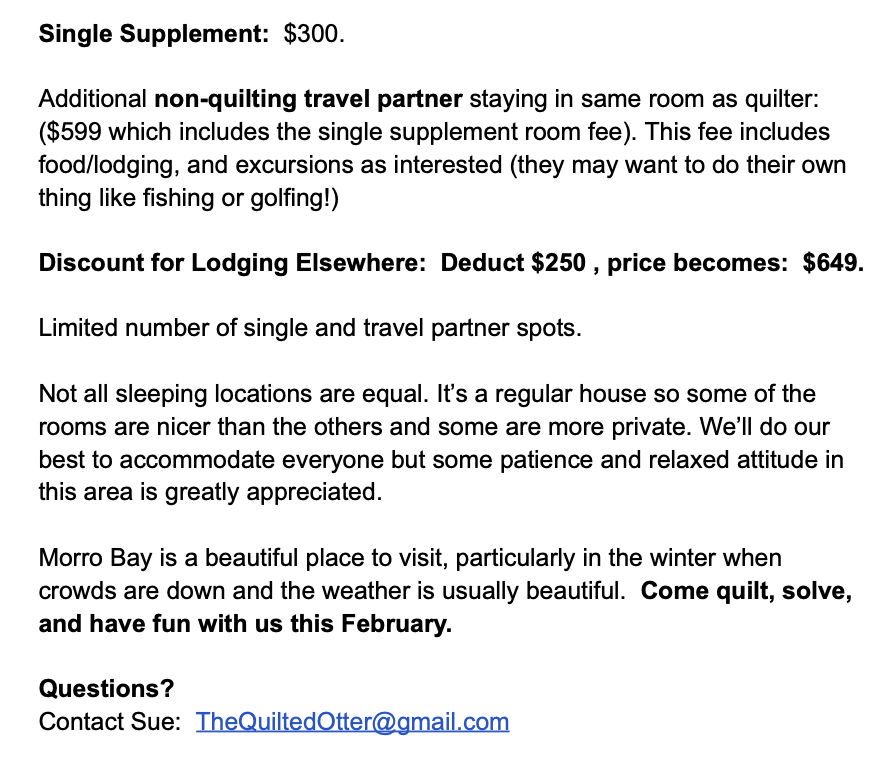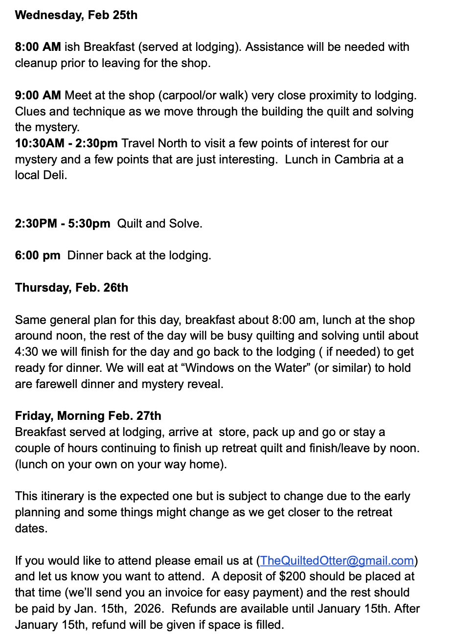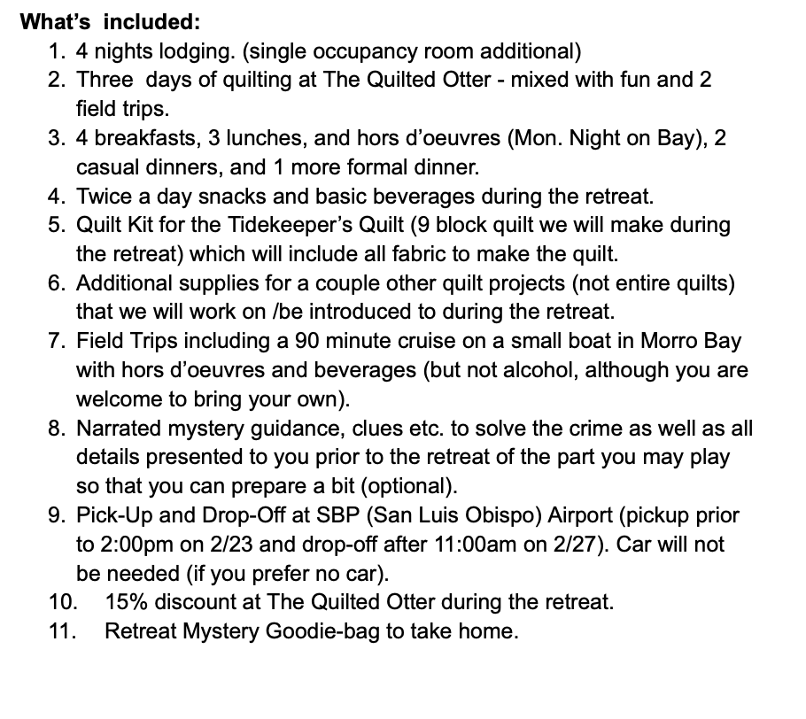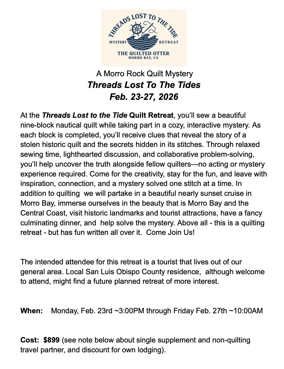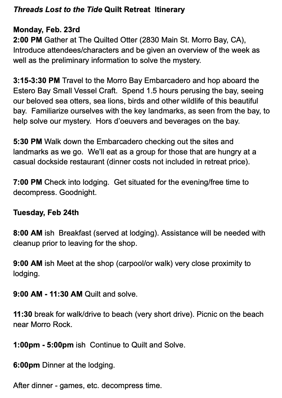 "Threads Lost To The Tide" : A Morro Rock Quilt Mystery Retreat